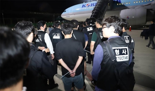 Các nghi phạm lừa đảo trực tuyến được áp giải ra sân bay ở tỉnh Kandal, Campuchia. Ảnh: Tân Hoa xã |