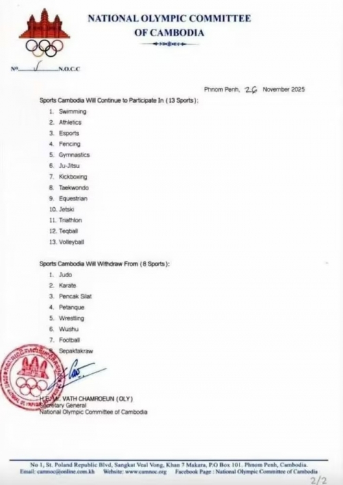 Ủy ban Olympic Campuchia vừa gửi thư đến Ban tổ chức SEA Games 33 - 2025, thông báo rút khỏi 8 môn thi đấu tại SEA Games 33 do Thái Lan đăng cai từ ngày 9 đến 20-12.