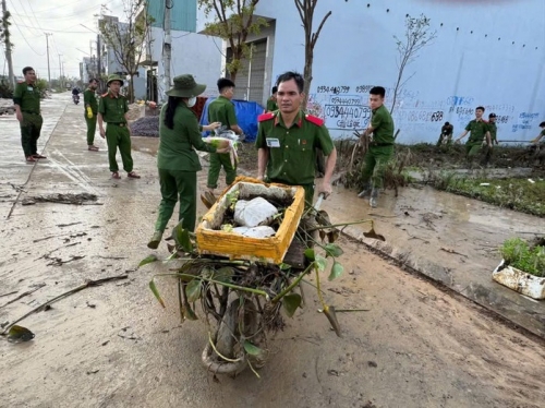 Lực lượng được Bộ Công an chi viện dọn dẹp vệ sinh môi trường tại phường Quy Nhơn Đông, tỉnh Gia Lai vào sáng 24-11 |