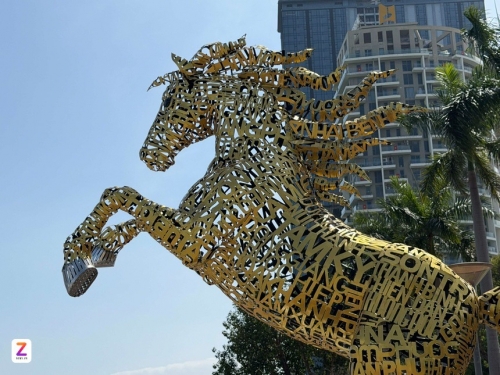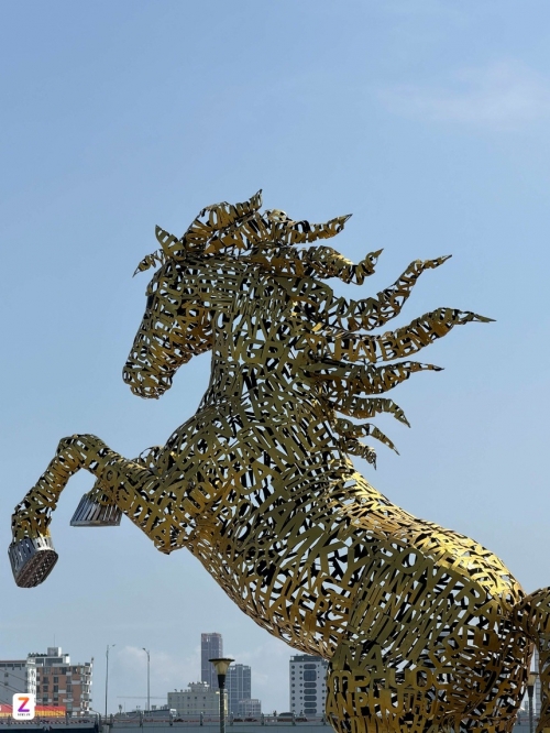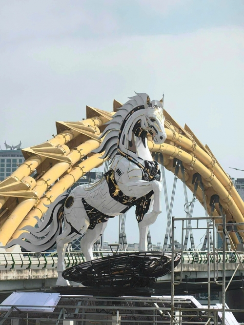 Theo đơn vị thi công, linh vật ngựa có tên "Kim mã 4.0" tại Đà Nẵng vẫn đang được thi công phục vụ trang trí Tết. Tác phẩm được thiết kế theo phong cách hiện đại, lấy cảm hứng từ hình tượng ngựa kết hợp yếu tố công nghệ, biểu trưng cho sự phát triển năng động, đổi mới và tinh thần chuyển đổi số của Đà Nẵng. Ảnh: Moon Black. |