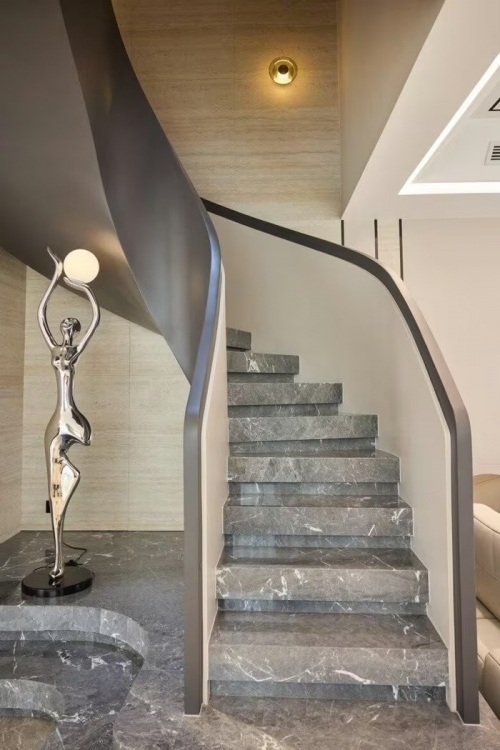 Bậc thang được ốp đá marble xám vân trắng, tay vịn uốn cong mềm mại. Ảnh: FBNV |