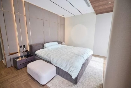 Phòng ngủ master thiết kế ấm cúng với tường ốp, giường bọc đệm dày và ánh sáng dịu nhẹ. Ảnh: FBNV |