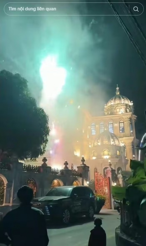 Giây phút bắn pháo hoa đón năm mới ngay trong sân vườn của biệt thự khiến người dân khắp xã kéo tới chiêm ngưỡng. Ảnh chụp màn hình |