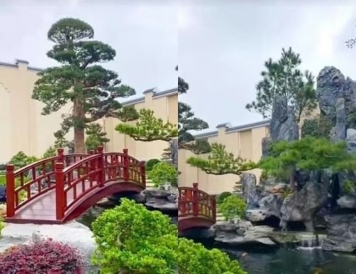 Ngay lối vào là 8 cây Tùng La Hán được bố trí trang trọng, giá trị ước tính lên tới vài chục tỷ đồng. Ảnh chụp màn hình |