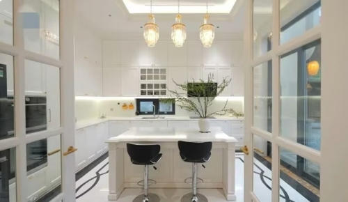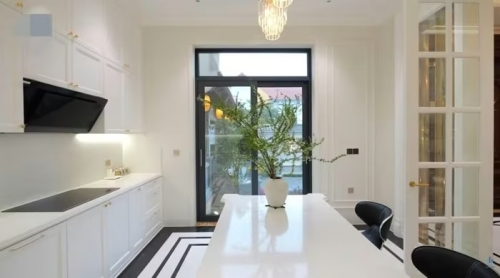 Phòng bếp được ngăn cách với các khu vực khác bằng cửa kính lớn. Ảnh chụp màn hình NhaF |