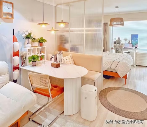 Bàn ăn đặt giữa phòng khách và phòng ngủ, tạo cảm giác mềm mại trong việc phân chia không gian. Ảnh: Tóutíao |