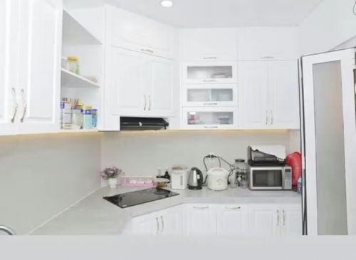 Khu bếp hiện đại với hệ tủ trắng, có đầy đủ thiết bị gia dụng thông minh, phục vụ nhu cầu nội trợ hàng ngày. Ảnh: FBNV |