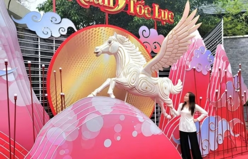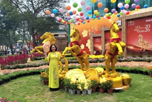 Trong khi đó, tại sân 4A, Nhà Văn hóa Thanh niên thành phố, người dân, du khách khá thích thú với hình ảnh linh vật ngựa "bay" ra từ đóa hoa mai vàng rực rỡ được treo trước cổng ra vào khu vực tổ chức lễ hội.