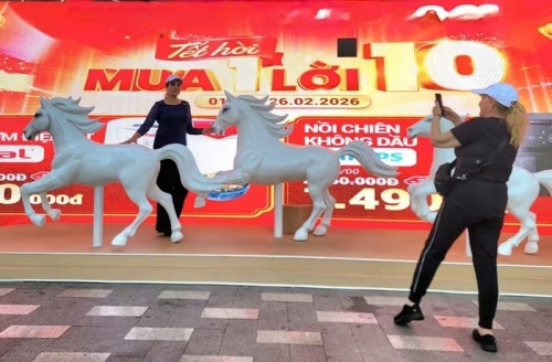 Du khách nước ngoài chụp ảnh lưu niệm với linh vật ngựa tại một trung tâm điện máy trên đường Trần Hưng Đạo, phường Cầu Ông Lãnh. Ảnh: Quang Phương |