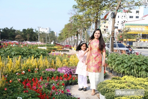 Nhiều người dân tranh thủ mặc áo dài ra check – in cùng với vườn hoa ở đường Hồ Tùng Mậu. |