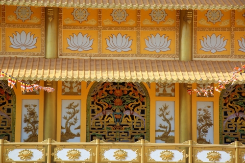 Công trình sử dụng gam màu vàng chủ đạo, tạo nên diện mạo nổi bật giữa không gian chùa. |