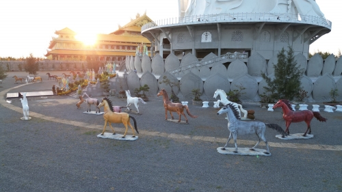 Dưới chân tượng Quan Âm là cụm tượng đàn ngựa, tạo điểm nhấn cho không gian quảng trường chùa Minh Đức. Trong văn hóa Phật giáo, hình tượng ngựa gắn với tinh thần tinh tấn, bền bỉ trên hành trình tu tập, thường được nhắc đến qua tích ngựa Kiền Trắc trong Phật sử. |