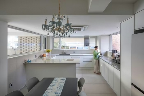 Do không đủ diện tích chia thành các phòng ngủ riêng, nhóm thiết kế mở rộng tầng một, tạo sảnh đón mới và biến không gian này thành khu bếp kết hợp phòng ăn. Ảnh: Architecture Studio YEIN |
