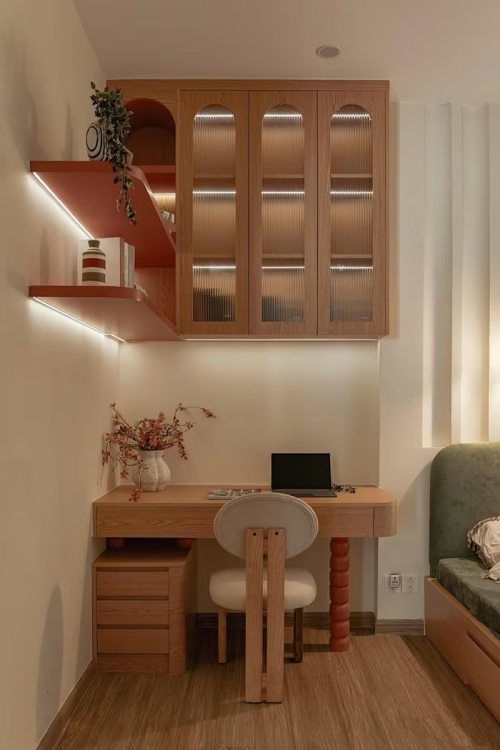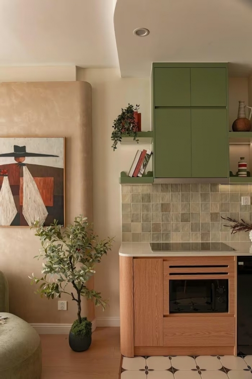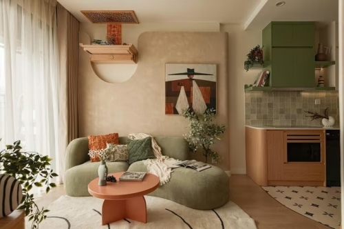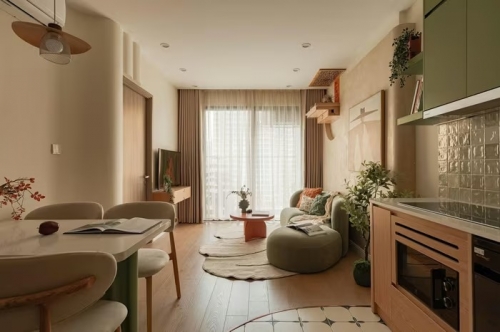 Để giải quyết bài toán diện tích hạn chế, căn hộ sử dụng bảng màu ấm với tông be làm chủ đạo, kết hợp cùng sắc xanh lá cây và các điểm nhấn màu cam. Sắc be giúp nới rộng không gian về mặt thị giác, xanh lá mang lại cảm giác thư giãn, trong khi màu cam được điểm xuyết tinh tế để tạo chiều sâu và cá tính cho ngôi nhà.