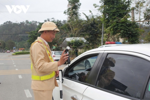Đây là một trong những nội dung trọng tâm của kế hoạch cao điểm bảo đảm trật tự, an toàn giao thông dịp nghỉ Tết năm nay. Theo đại diện Cục Cảnh sát giao thông, căn cứ lịch nghỉ Tết của người lao động từ ngày 14/2 đến hết 22/2, lực lượng cảnh sát giao thông toàn quốc sẽ ứng trực 100%, triển khai cao điểm bảo đảm an toàn giao thông kéo dài thêm 2 ngày trước và sau kỳ nghỉ. (Trong ảnh là chốt kiểm tra nồng độ cồn tại địa bàn phường Vinh Phú (Nghệ An). |