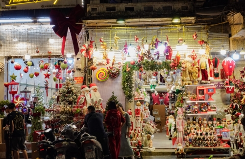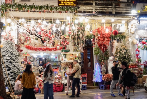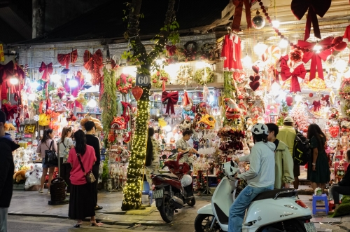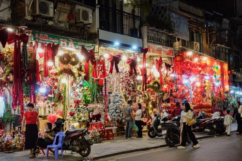 Giữa đêm Noel se lạnh, Hàng Mã vì thế không chỉ mang sắc màu lễ hội quen thuộc, mà còn thêm vào một nét "độc lạ" rất riêng - nơi Giáng sinh và Tết vô tình gặp nhau trên cùng một con phố, khiến ai đi qua cũng khó quên.