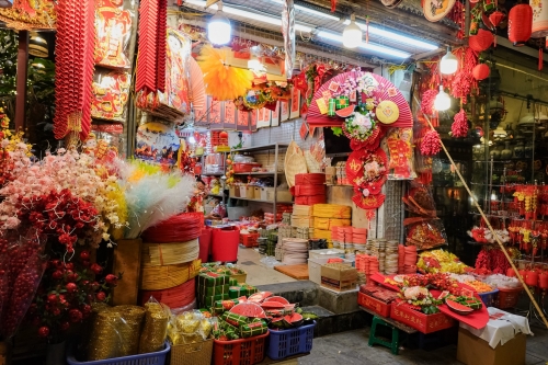Những quả cầu trang trí đỏ rực, dây treo chữ chúc năm mới, phong bao lì xì, đồ decor mang không khí xuân bắt đầu xuất hiện ngay cạnh các cửa hàng bán đồ Giáng sinh. Màu đỏ đặc trưng của Tết nổi bật hẳn lên giữa không gian Noel, tạo nên một khung cảnh vừa lạ lẫm, vừa thú vị.
