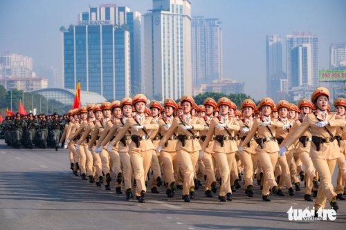 Các khối nam sĩ quan Cảnh sát nhân dân, nam An ninh nhân dân, nữ cảnh sát giao thông, nam sĩ quan đặc nhiệm... bước qua lễ đài - Ảnh: HÀ QUÂN |