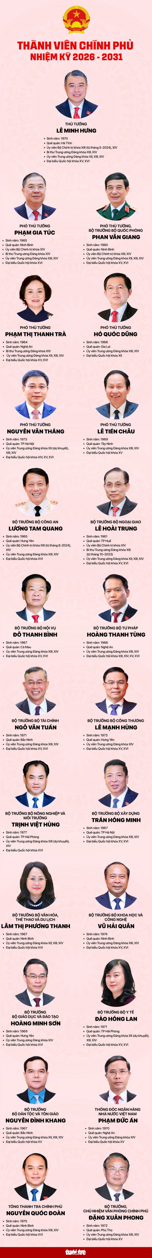 Thủ tướng Lê Minh Hưng và các Phó thủ tướng nhiệm kỳ mới - Ảnh: NGUYỄN KHÁNH - Đồ họa: NGỌC THÀNH |