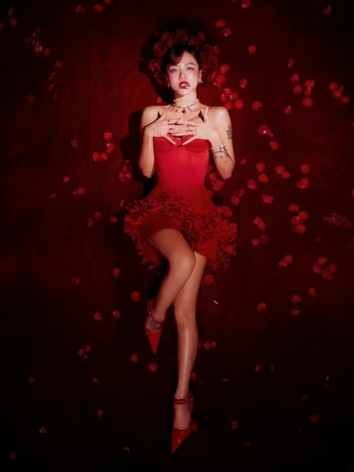 Nữ ca sĩ diện thiết kế váy quây bó sát với phần corset tôn vinh đường cong triệt để. Điểm nhấn là phần chân váy xòe rộng được kết từ hàng ngàn cánh hoa, tạo cảm giác như cô đang bước ra từ một đóa hồng nhung nở rộ. (Ảnh: IGNV) |