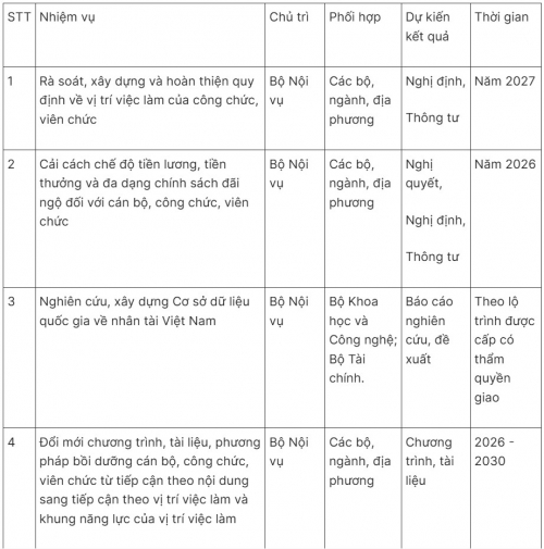 Tại quyết định, Thủ tướng Chính phủ cũng giao cho Bộ Nội vụ chủ trì phối hợp với các bộ ngành liên quan xây dựng cải cách chế độ tiền lương, tiền thưởng và đa dạng chính sách đãi ngộ đối với cán bộ, công chức, viên chức ngay trong năm 2026.