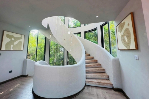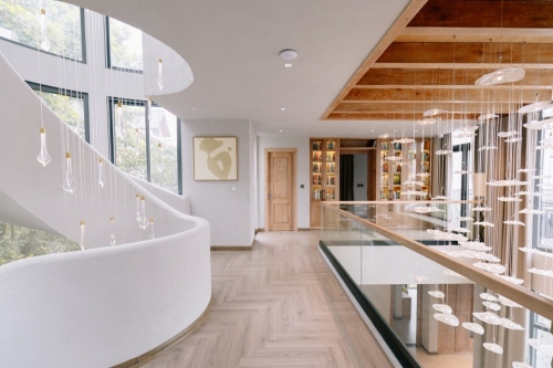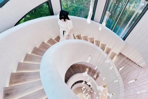 Vật liệu chủ đạo là gỗ sồi, đá tự nhiên và kính. Các mảng cửa kính lớn được bố trí để lấy sáng, mở tầm nhìn ra vườn. Theo chị, đó là bức tranh thiên nhiên sống động nhất mà không cần thêm bất kỳ chi tiết trang trí nào. Cầu thang xoắn ốc 3 tầng cùng dàn đèn chùm được lấy cảm hứng từ những giọt mưa ánh sáng nước, là điểm nhấn trong kiến trúc tổng thể.