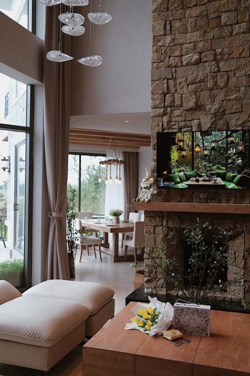 Căn nhà nghỉ dưỡng của chị Xuân được thiết kế theo phong cách Bắc Âu, phù hợp với quần thể “làng Châu Âu” nơi gia đình sinh sống. Chị ưu tiên không gian mở, nhiều cây xanh và ánh sáng tự nhiên, đồng thời đảm bảo công năng sử dụng cho cả nhà 6 người.