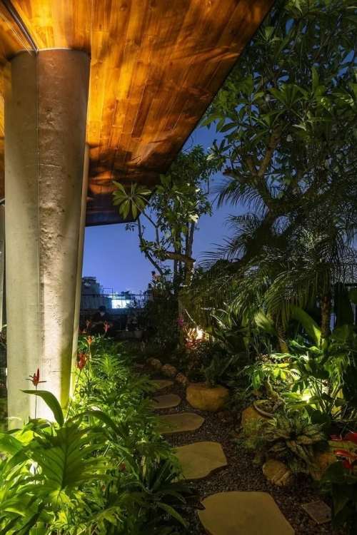 Trên một khu đất hạn chế được quản lý bởi các quy định xây dựng nghiêm ngặt, thay vì tối đa hóa diện tích sàn thương mại, kiến trúc sư đã thuyết phục gia chủ hy sinh một phần bên ngoài để tạo nên những bậc thang mềm mại gợi lên đài hoa - nơi họ đặt một khu vườn xanh tươi. Ảnh: Triệu Chiến |