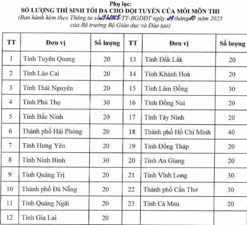 Về số lượng thí sinh dự thi, Quy chế mới quy định: Đối với kỳ thi chọn học sinh giỏi quốc gia, mỗi đơn vị dự thi được đăng ký tối đa 10 thí sinh cho đội tuyển mỗi môn thi. Riêng đơn vị dự thi Hà Nội được đăng ký tối đa 20 thí sinh cho mỗi đội tuyển). Các đơn vị dự thi thực hiện sắp xếp đơn vị hành chính cấp tỉnh thì thực hiện như sau: