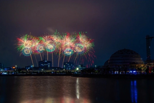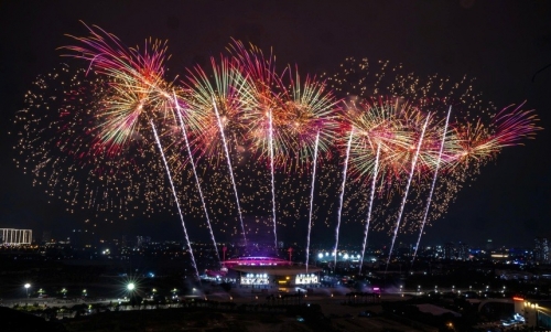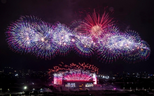 Từ nhiều khu vực xung quanh SVĐ, người dân có thể quan sát màn pháo hoa mãn nhãn từ tầm cao. Bên cạnh màn trình diễn pháo hoa, tối 21/1, ban tổ chức cũng đã tiến hành tổng duyệt chương trình nghệ thuật đặc biệt "Dưới lá cờ vẻ vang của Đảng", quy tụ lực lượng hàng nghìn nghệ sĩ. Ảnh: Sun Group. |