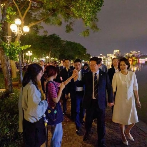 Tối ngày 23/4, Tổng thống Lee Jae Myung cùng phu nhân dạo quanh hồ Hoàn Kiếm và giao lưu cùng người dân.