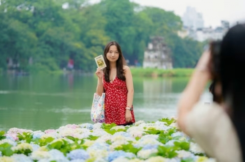 Du khách chụp ảnh tại hồ Hoàn Kiếm dịp 2/9/2025. Ảnh: Linh Huỳnh. |