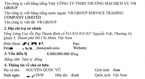 VB Group chính là pháp nhân sở hữu thương hiệu mỹ phẩm Hanayuki. Trên trang web chính thức, công ty này đang phân phối nhiều dòng sản phẩm chăm sóc cá nhân và làm đẹp như sữa rửa mặt, kem chống nắng, kem đánh răng và dung dịch vệ sinh... giá bán dao động từ 200.000-600.000 đồng.