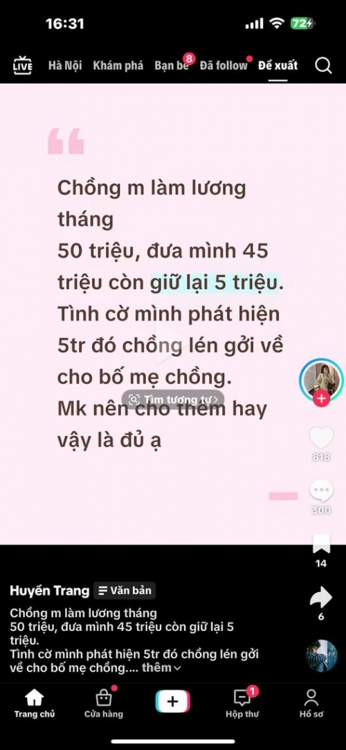 "Chồng em lương tháng 50 triệu, đưa em 45 triệu, giữ lại 5 triệu. Tình cờ em phát hiện 5 triệu đó anh ấy gửi về cho bố mẹ chồng. Em nên cho thêm hay vậy là đủ?".
