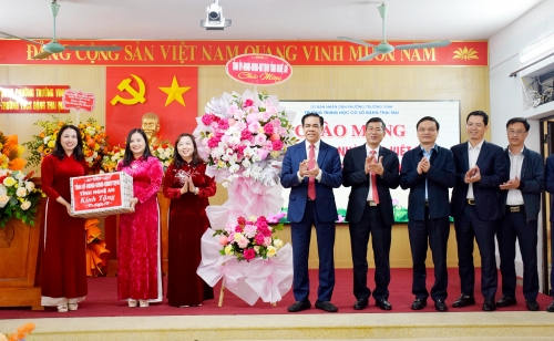 Chủ tịch UBND tỉnh Võ Trọng Hải chúc mừng những thành tích nổi bật của Trường THCS Đặng Thai Mai |