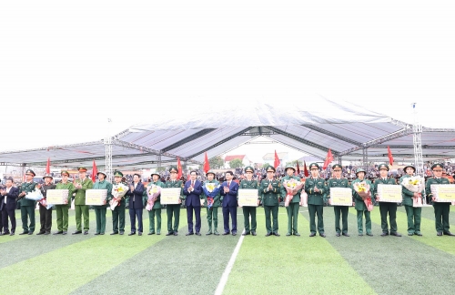Chủ tịch UBND tỉnh Võ Trọng Hải cùng các đại biểu tham dự lễ giao, nhận quân năm 2026 tại Ban Chỉ huy Phòng thủ khu vực 3 - Quỳ Châu |