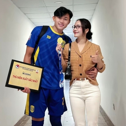 Ở hậu trường trận chung kết, hình ảnh Bảo Ngọc tình cảm cùng bạn gái cũng nhanh chóng viral. Nhiều người hâm mộ tò mò về danh tính cô nàng và chuyện tình cảm của cặp đôi. Bạn gái của thủ môn là Nguyễn Thị Ngọc Linh, thí sinh nổi bật của cuộc thi Miss VinhUni (Hoa khôi Đại học Vinh) năm 2025. |