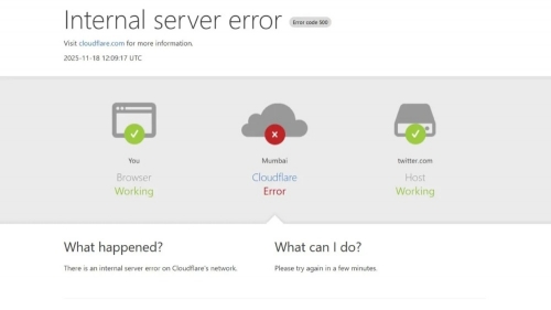 Người dùng liên tục nhận được thông báo tạm dịch sang tiếng Việt là “lỗi máy chủ nội bộ” với “Mã lỗi 500”, kèm theo hình ảnh cho thấy lỗi bắt nguồn từ hệ thống của Cloudflare.
