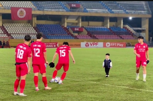 Ngay sau khi tiếng còi mãn cuộc vang lên với chiến thắng 2-0 cho CAHN, trung vệ Trần Đình Trọng nhanh chóng tiến về phía khán đài để đón con trai – bé Luffy xuống sân cùng chia vui. Trong bộ vest nhỏ nhắn và chỉnh tề, cậu bé khiến không ít khán giả thích thú vì sự đáng yêu. Chỉ vài phút sau, khi nhìn thấy trái bóng lăn trên sân, Luffy lập tức tỏ ra phấn khích, chạy theo và tung những cú sút ngắn.
