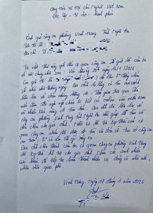 Gia đình em A. viết thư cảm ơn Công an phường Vinh Hưng |