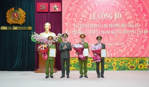 Trao các quyết định của Bộ trưởng Bộ Công an về việc bổ nhiệm chức danh Thủ trưởng Cơ quan Cảnh sát điều tra Công an tỉnh đối với đại tá Nguyễn Anh Tuấn, Phó Giám đốc Công an tỉnh Thanh Hóa, và chức danh Thủ trưởng Cơ quan Thi hành án hình sự, Thủ trưởng Cơ quan quản lý tạm giữ, tạm giam Công an tỉnh Thanh Hóa đối với thượng tá Kim Duy Cương, Phó Giám đốc Công an tỉnh.