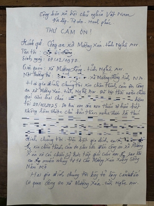 Gia đình cháu L. xúc động viết thư cảm ơn Công an xã Mường Xén |