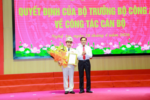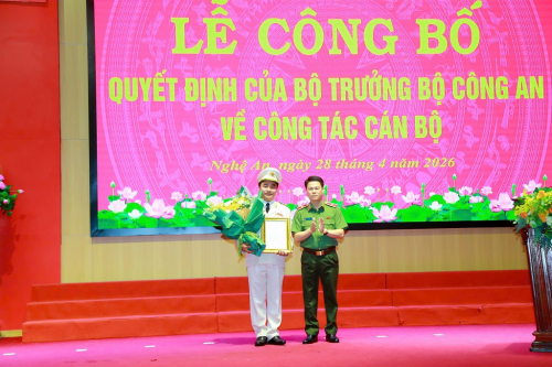 Thừa ủy quyền của Bộ trưởng Bộ Công an, đồng chí Thiếu tướng Đinh Việt Dũng, Ủy viên Ban Thường vụ Tỉnh ủy, Bí thư Đảng ủy, Giám đốc Công an tỉnh trao Quyết định cho đồng chí Đại tá Nguyễn Huy Khích, Phó Giám đốc Công an tỉnh Nghệ An |