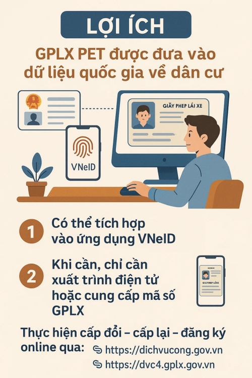 Khi chuyển đổi sang thẻ PET, toàn bộ dữ liệu GPLX sẽ được số hóa và cập nhật vào cơ sở dữ liệu quốc gia về dân cư. Người dân có thể tích hợp GPLX vào ứng dụng VNeID – hệ thống định danh điện tử quốc gia, để xuất trình hoặc cung cấp thông tin trực tuyến khi lực lượng chức năng yêu cầu kiểm tra.