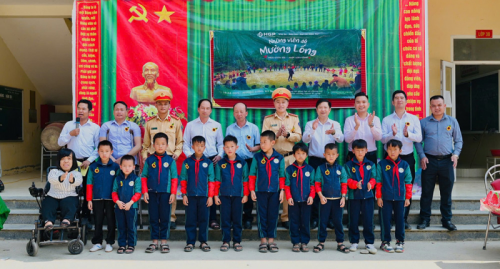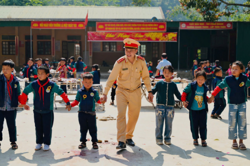 CSGT Công an Nghệ An cùng Công ty CP Đầu tư và Thương mại Hoàng Gia Phát và các nhà đồng hành động viên các em học sinh vùng cao xứ Nghệ. |
