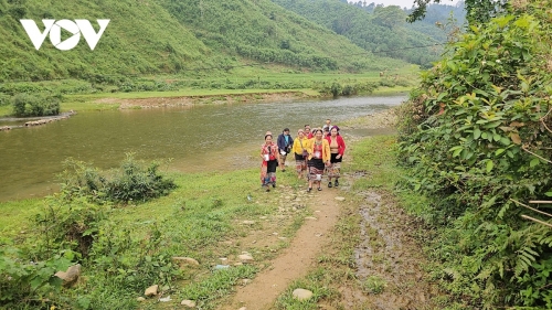 Cử tri bản Mọi, xã Môn Sơn vượt suối đi bầu cử sớm. (Ảnh: Bá Thăng). |