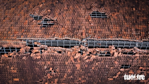 Mái ngói của Trường THPT chuyên Lê Quý Đôn, phường Quy Nhơn, Gia Lai, tan hoang do gió bão số 13 - Kalmaegi - Ảnh: TẤN LỰC |