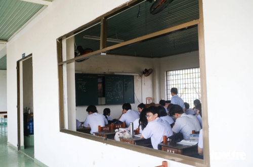 Học sinh Trường THPT chuyên Lê Quý Đôn ngồi học trong những căn phòng bị gió bão thổi bay cả cửa chính lẫn cửa sổ |
