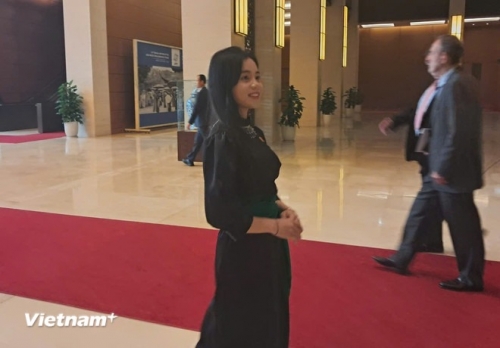 Đại biểu Quốc hội Lo Thị Bảo Vy phấn khởi bước vào nghị trường Quốc hội với vai trò nữ đại biểu Quốc hội trẻ nhất khóa XVI. (Ảnh: Hùng Võ/Vietnam+) |