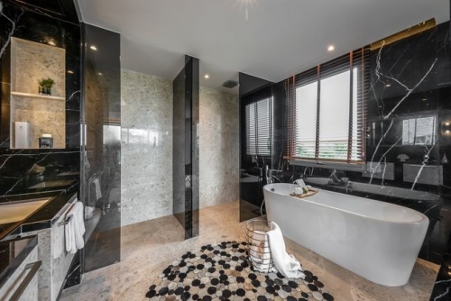 Chậu rửa đôi cho phép hai người cùng vệ sinh mà không cần chờ đợi, bên cạnh có bồn tắm mở để tắm nước nóng vào những buổi tối mùa đông. Ngoài ra, phòng tắm vòi sen và khu vực vệ sinh được ngăn cách bằng kính, giúp phân chia khu vực khô và ướt, tránh sự ngượng ngùng.